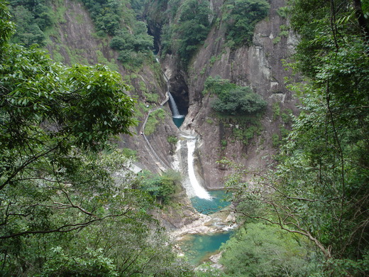 铜铃山国家森林公园景区位于浙江省文成县,位于岩门大峡谷上游的叶胜林场境内,长约5公里,面积2755公顷。境内拥有上万亩的原始次生林,为浙南保存最好的原始阔叶林。其中以铜铃山峡中经万年激流旋冲而成的壶穴奇观最为著名,峡内瀑连瀑,潭叠潭,湍流雷轰,震心慑憾,峡谷摩幻,称为“华夏一绝”。 主要景点 铜铃峡景区:峡谷宽处百余米,狭窄处四五米。两旁茂密的半原始阔叶林盖地。林中百鸟争鸣,一年四季,繁花似锦,野果累。谷中碧潭、奇岩、秀滩目不暇接,令人拍案惊奇。在铜铃山峡入口处,一湖面积约4平方公里,湖水碧绿。有坝高80米,溢洪闸开启时,二十余米宽的水帘奔腾而下,如云海垂泻,万马奔腾,震撼峡谷;阳光下,百虹悬空,壮观至极。 斗潭:从深山蜿蜒而出的五龙坑汇于潭口。坑口潭头外,有岩状如怪兽;潭旁有一岩洞;潭品余米处,巨岩成闸,形成岩门。传说,近旁的砂加坪村有一纪姓师公,垂钓于头斗潭,钓来成桶的红鲤、黑鲤。鲤鱼提回家时,顷刻成一桶树叶。师公屈指一算,知是一妖怪与自己作对,便在家中摆上香案,吩咐妻子,他走一小时后,在北京市金鼓密催,斗灯米密撒,助他与妖怪斗法。妻子贪 玩且健忘,纪师公一走,去串门忘了归家,师公民妖怪一场恶战,缺少金鼓助威,神兵助阵,虽终制服妖怪,却精力丧尽,一命呜呼,斗潭因而得名。 鳄鱼潭:距斗潭四十余米处。清澈见底的潭面,一石如鳄鱼从水中探出脑袋,圆睁着眼球,窥视着四围。潭旁还有许多水类动物在戏水。潭旁有巨岩,岩坛上可坐数十人。鳄鱼潭上首,还有长方形深潭,人称方潭。鳄鱼潭和方潭中,鱼穿梭畅游,坐于岩去垂钓,可谓一绝。 卧狮岩: 鳄鱼潭外有一石,象一只雄狮静卧于碧绿的溪旁,沉醉于青山经水之间,人们称之卧狮岩。卧狮岩后山粱,当地人称五叶莲花山。相传为女祸五叶莲花宝座弃此而成。 龙潭: 鳄鱼潭之水潇潇洒洒,前行八十余米,附下石壁,瀑流如帘,飘飘扬扬,瀑下是龙潭。潭很深,且很大,碧绿的水倒映着潭壁上的古树、古藤和两岸青山五彩缤纷的树木花果。潭 前有一小桥连接两岸。深潭、流水、小桥、古藤、老树、野果组成了一幅美妙绝伦的水墨画。 白郎漈:龙潭边的山峡内,一水从89米漈头泻下在岩石中迥旋而出,再奔下15米的绝壁,气势颇为壮观,人称白郎漈。相传,白郎为后母歧视,责其每天到山峡打柴。白郎与龙女从相遇到相爱,在铁拐李的帮助下,有情人终成眷属,白郎漈由此得名。 孝竹滩:龙潭外,峰回水转,豁然开朗,一个长数百米,宽六十余米的大滩呈现眼前。滩旁长满竿如拇指大,高2米余的小竹,叫教顺竹。此竹出小笋时,顶部老根部嫩,人叫杵笋。相传一大荒年,人们挖尽了野菜和草根,一孝子祷求老天母命,老天见怜,令这一带小竹出笋,以救饥民,故称孝顺竹。但恶媳妇虐待婆婆,嫩的笋顶自己吃,老的要部给婆婆吃。老天发怒,令小竹笋顶部先老,以惩罚恶媳妇。从此,小竹笋背上个"忤逆笋"的恶名。滩旁山上还有双猿岩、卧牛山、白狼处诸景。 白鳍豚:在孝竹内。一石自滩中的沙石中探出头和身来,状如一只白鳍豚,故名。 钻山牛:滩左侧,巨峰拔地而起,似有一牛钻进巨峰,只留一屁股在外,欲进不能,欲退无路。若用耳巾壁细听,灵性之人还能听到牛"哞哞"的叫声。 灵崖:孝竹滩右侧山上,一崖耸立,从一侧看象个公鸡头,从另一侧看象个将军,再从另一方向看,又似驼峰,们称为灵崖。灵崖稍上有一崖,如观音娘娘立于浩浩长风之中,人称观音崖。 十二埕:(十二葫芦潭)孝竹滩口忽地收紧,碧水从滩口的巨石堆中穿梭而下,注入100余米长,四米宽的窄峡,天如一条飘带。峡旁为S形连环石壁,光滑如磨,鬼斧神工,佳景天成。峡内一串大小不等的圆形深潭,形如酒埕,口啵中大底小,人称十二埕。相传早年一龙女欲嫁凡间,龙王大怒,将其困于这深山龙潭以示惩罚。铁拐李云到此,见状抱不平,要助龙女腾出这深谷,遂其婚嫁之愿。龙女长叹:父王在前面峡内布下十二龙门,又用龙宫珍宝招魂铜铃化作百丈巨崖镇 着峡口。铁拐李将葫芦抛出,顿时飞沙走石,昏天黑地,葫芦砸开十二龙门。铁拐李又暗用移山倒海之法将招魂铜铃移向别处。龙女终于腾出龙潭,吐龙珠于潭口,脱 龙鳞于长滩,冲开十二龙门而云。铁拐李砸十二龙门时用力过猛,故留下了十二个葫深潭。 虎口二瀑:十二埕口,状如考虑张开的血盆大口。水从十二埕口下,直入十余米高的崖潭,称为虎口一瀑。崖潭之水复出直下30余米绝壁成虎口二瀑。抬头望,瀑口两旁是直耸云天的悬崖峭壁。 壶穴潭:虎口瀑下,是一圆形深潭,深潭口小中大。潭水碧绿,深不见底。潭外立着一块十余米高、数米宽的石屏;潭旁近百米高的岩壁,长满古藤古树,堪称一绝。风景名胜专家、北京大学谢凝高教授称壶穴潭为天下特景。 银坑洞:壶穴潭外右旁悬崖峭壁有一石洞,口高3米,深难测。据传此洞由宋代采银者开凿,附近仍遗存有石磨盘、踏碓、捣臼、洗银石槽。一九八三年,湖南一老翁曾在此洞捕猴子15只。 飞龙沟:虎穴潭外,碧水淌过光滑的石滩,滩底赤石成片,阳光下,随着水波纹的晃动,如道道碧血流淌。相传龙女冲出十二龙门,浑身鲜血淌于滩而染。 |