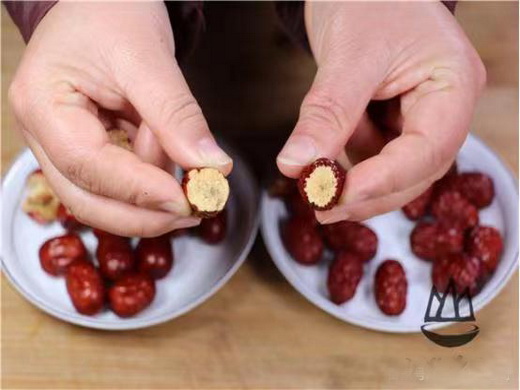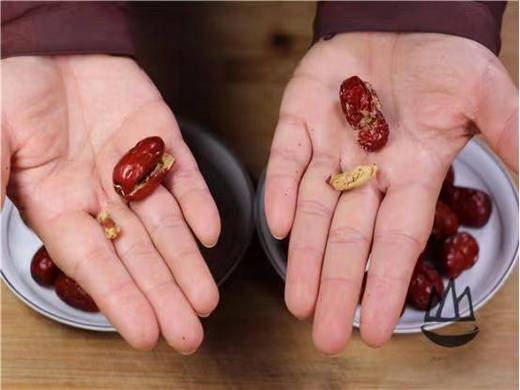我们还可以用看枣核的方法来区分是否是硫磺红枣。用手把红枣掰开,如果枣核很容易剥落说明是硫磺红枣。如果很难剥落,上面总是粘着果肉说明这个是自然风干的红枣。